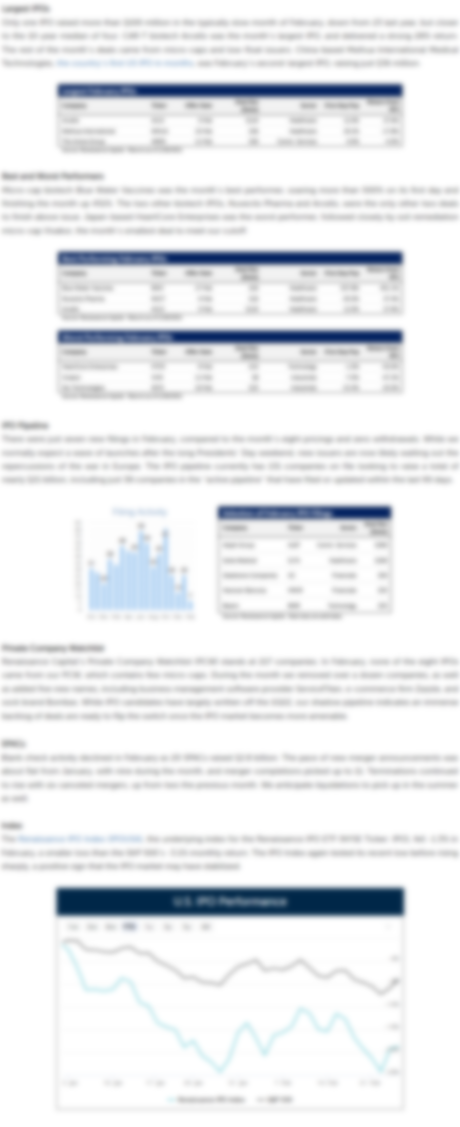 In February, eight IPOs raised $271 million, a 76% y/y decline in IPO count and a 97% drop in proceeds. February IPOs raised fewer proceeds than any month since November 2018. The month’s issuers were primarily micro-caps, as the average deal size shrank to a mere $34 million; just one deal raised more than $100 million. Issuance was slow as companies finished preparing 4Q21 financials, but recent poor performance and rising volatility halted the normal wave of launches after Presidents’ Day. On the bright side, the IPO market showed signs of finding a bottom, with the IPO Index down just 1%, outperforming the S&P 500. Half of the month’s IPOs came from the healthcare sector, with the remainder in industrials, communications, and technology. Blank check activity declined to 20 SPACs raising $2.8 billion, and withdrawals continued to roll in. The wave of volatile small issuers led to mixed returns: Just three of the month’s eight deals finished above offer (38%), though February IPOs averaged a 46% return thanks to one high-flying micro-cap, and averaged -12% without it. Pipeline activity slowed considerably, with just seven new IPO filings in February, likely signaling a slow March.